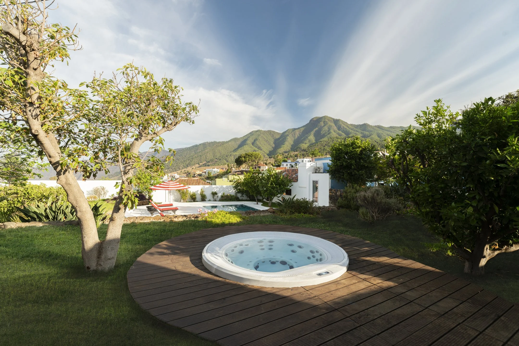 Der Jacuzzi bietet Ihnen eine ruhige Ecke für tiefe Entspannung im warmen Wasser. Er liegt leicht erhöht, von hier schaut man über das Meer und in die Berge.